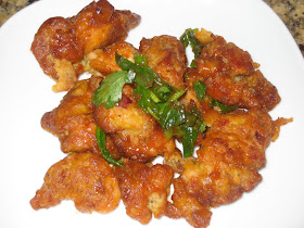 Contrary to the usual Indian chilli chicken, which is cooked in a gravy, I decided to use the same technique used in making American spicy wings. The fried chicken pieces were tossed in a bowl to which I had added soy sauce, hot sauce (chilli sauce), balsamic vinegar, ketchup, chopped green onions and chopped green chillies.