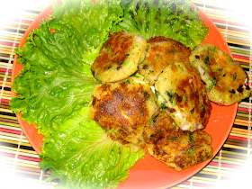 I started by grating the zucchini – this had to be done to ensure it mixed well in the dough. The grating also gave a nice uniform light green color to the patties. To this I added the mashed potato mix, chopped onions and cilantro, roughly chopped cheese chunks, salt, paprika and just about enough water to make little round and flattened patties. Then each one was shallow fried in heated canola oil.