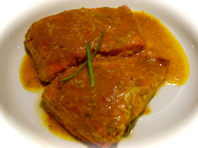 I pan-seared the salmon in very little oil for exactly 1 minute. This was just done to give a texture to the fish, taking care to see that the fish oils did not escape into the pan. The onion, ginger and green chillies were pureed and sauteed in olive oil for 15-20 minutes. After the puree was cooked thoroughly, I added turmeric, salt and paprika and cooked it for another 5 minutes. After this, I added coconut milk to the gravy, along with salt, sugar and mustard oil (optional). I also added some ketchup to give a reddish color. I decided to cook the fish by steaming. So each fillet was placed in a parchment paper which was placed on an aluminum foil in turn. I poured some of the gravy on the fish and covered each pouch tightly.
