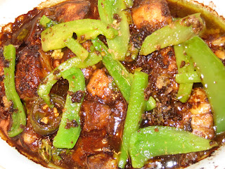 The bell peppers were added as a garnish. I decided to serve the fish with white rice. There chilli fish was ready! And yes, it was yummy.